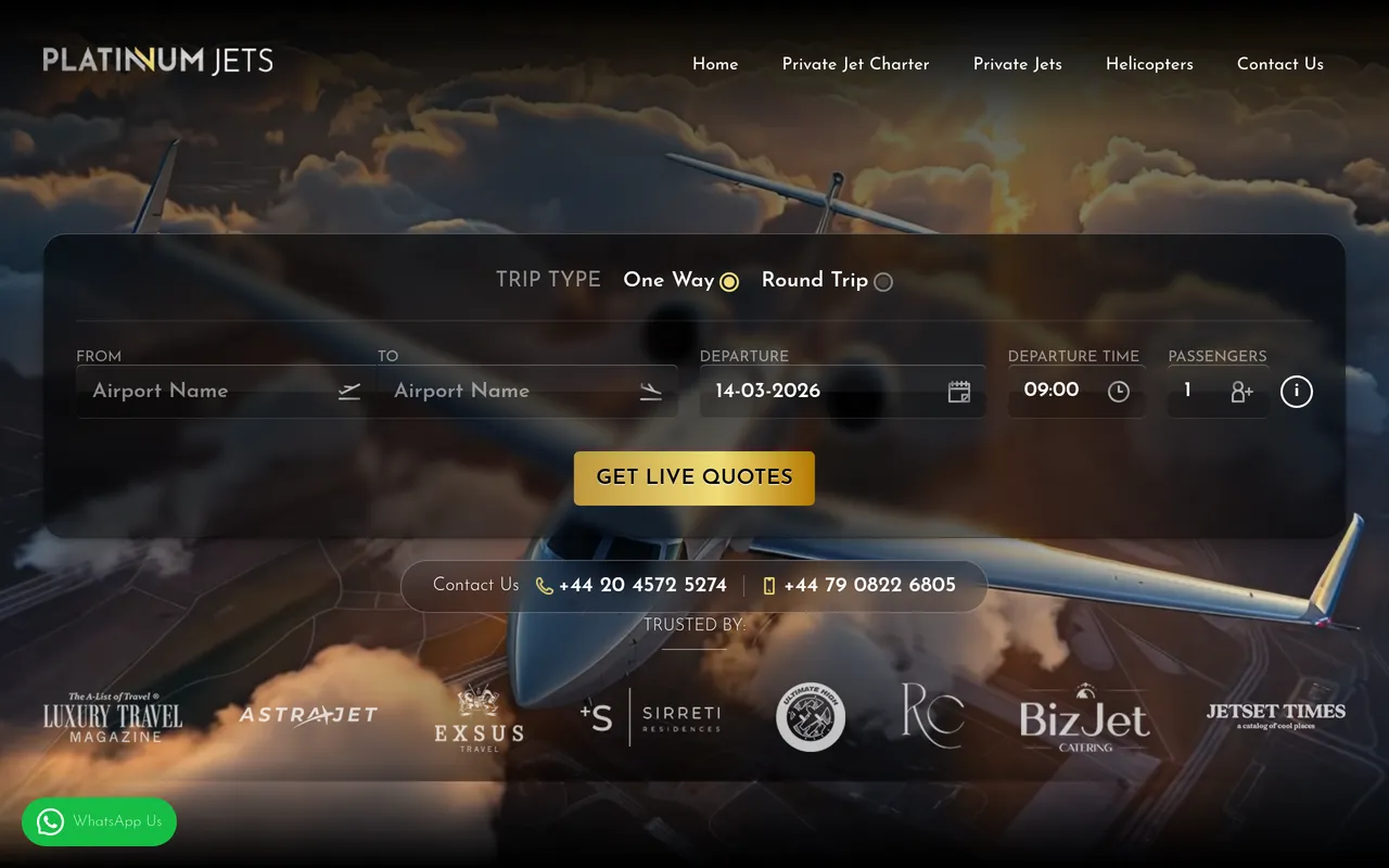 Platinum Jets is a boutique private jet charter company delivering tailored aviation solutions for those who expect more. From light jets to long-range aircraft and elite helicopter transfers, we provide seamless access to over 7,000 aircraft worldwide.